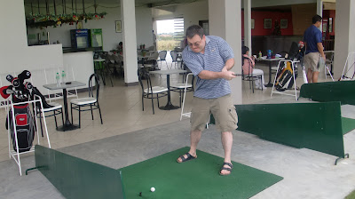 Yesterday, Andreas and Thomas tried the golf driving range. Just like the other neophytes in golf, there are some nice and bad shots. Let the picture just speak for itself and see for yourself how concentrated they are.